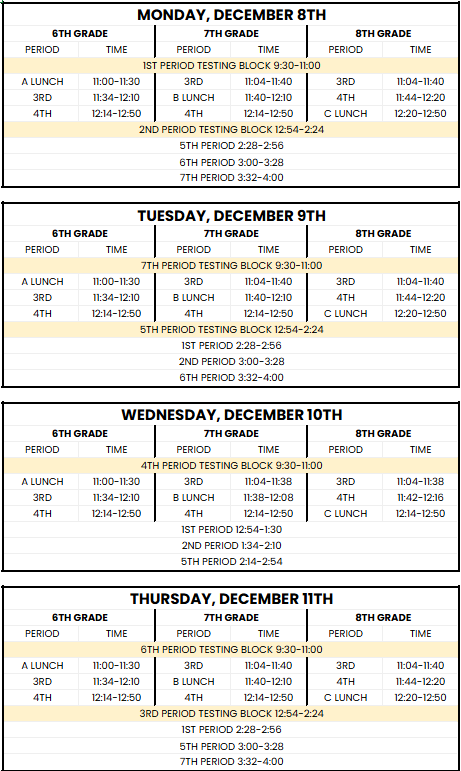 Winter Testing is coming up after Thanksgiving Break. We ask that all students get a good night's rest, have a hearty breakfast and come to school on time and prepared on the testing days. FAST ELA is on 12/2 and FAST Math is on 12/4. Common Final Exams and Progress Monitoring Activities will take place 12/8-12/11 for specific classes. If you are unsure whether your child takes a Common Final Exam or Progress Monitoring Activity, please ask your child or reach out to their teachers. Please see the schedules below.