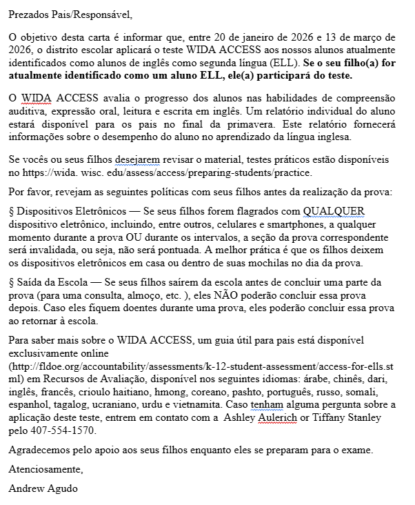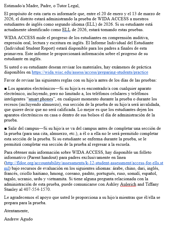 Parents of current ELL students, please see the information below about WIDA ACCESS Testing beginning Tuesday, January 20, 2026